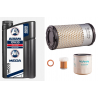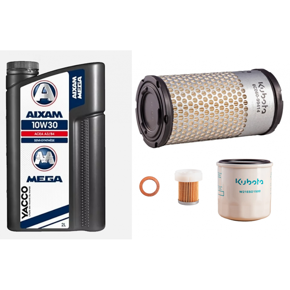 Le kit vidange avec filtration d'origine KUBOTA est composé d'un filtre à air rond, un filtre à gasoil , un filtre à huile, un bidon de 2 litres d'huile moteur (10W30) et un joint de vidange.